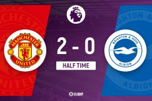 上半场伤停补时1分钟,半场结束,曼联暂2-0布莱顿。