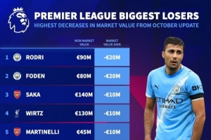 英超身价跌幅榜:罗德里和福登均下降2000万欧列前2,枪手4人上榜