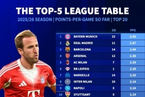 本赛季五大联赛场均拿分榜:拜仁3分拿满 皇萨枪列前四、巴黎第12